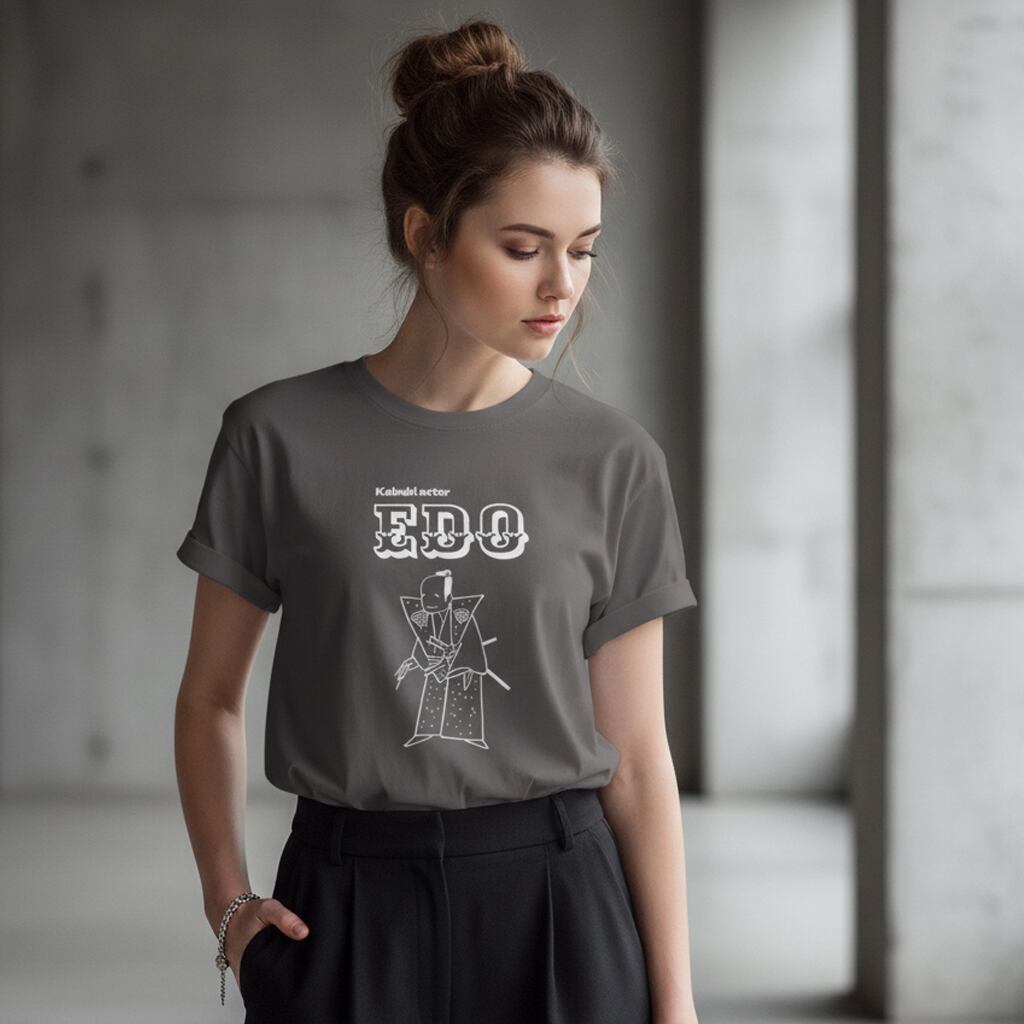 日本の伝統文化、歌舞伎役者をテーマにしたEdo ミニマルデザインTシャツです。洗練されたデザインが特徴で、シンプルながらも目を引く存在感を放ちます。