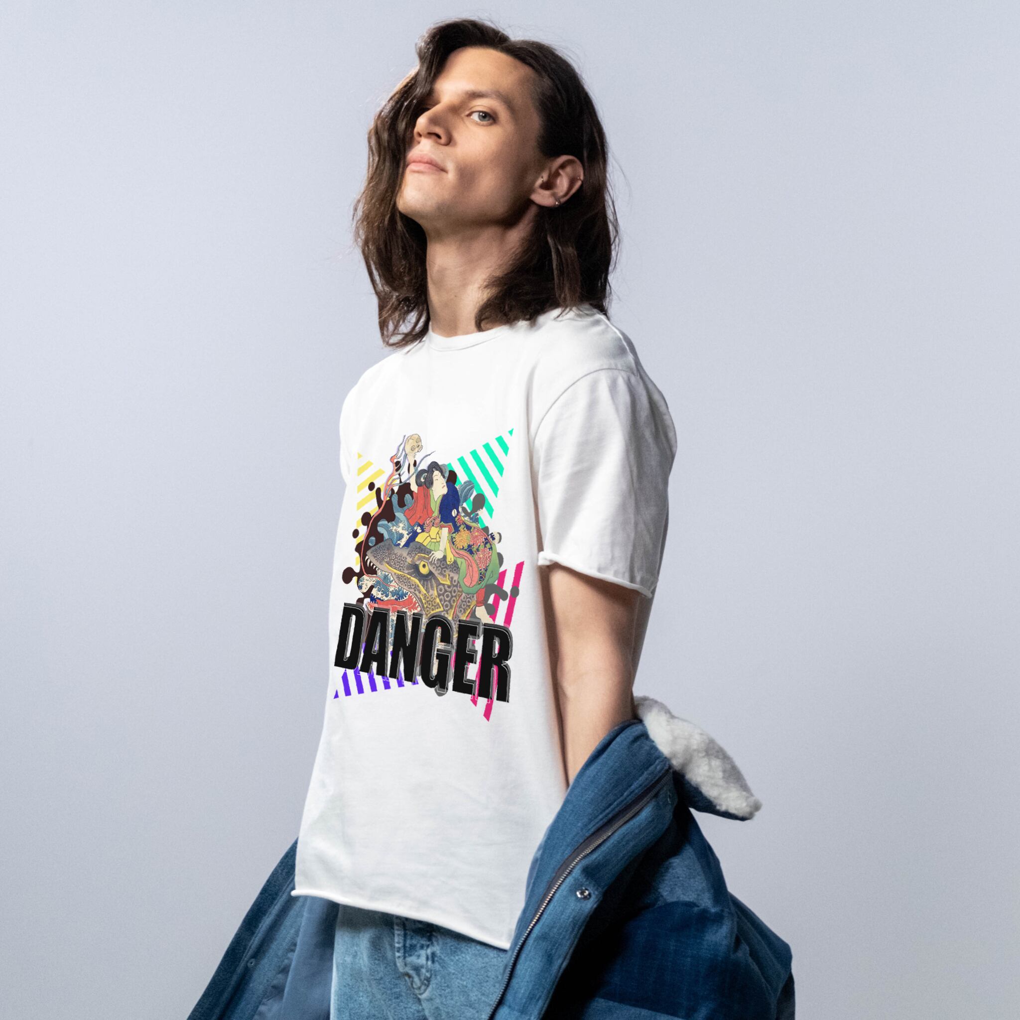 躍動感あふれる白菊丸の姿と、ポップな色、そして大胆な「DANGER」の文字を組み合わせました。
