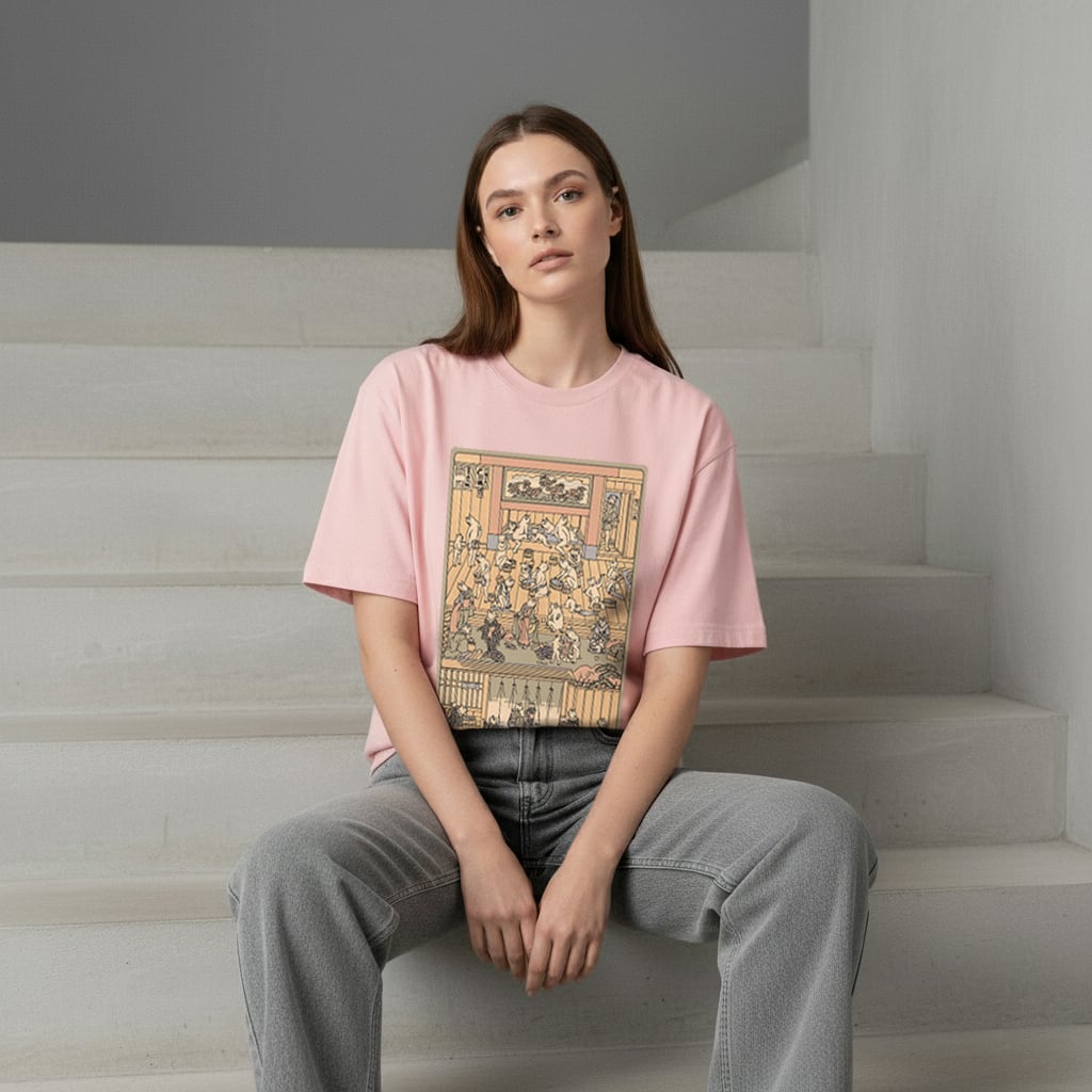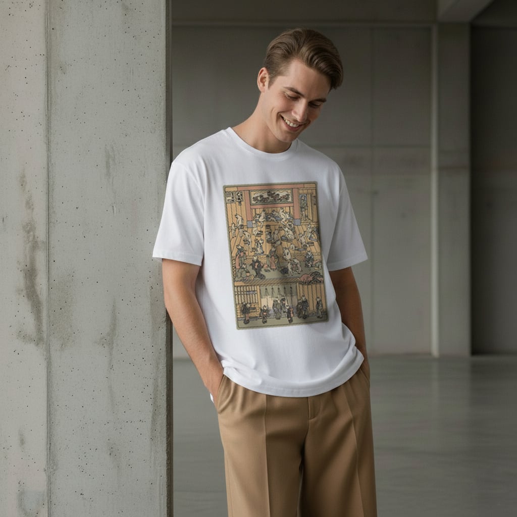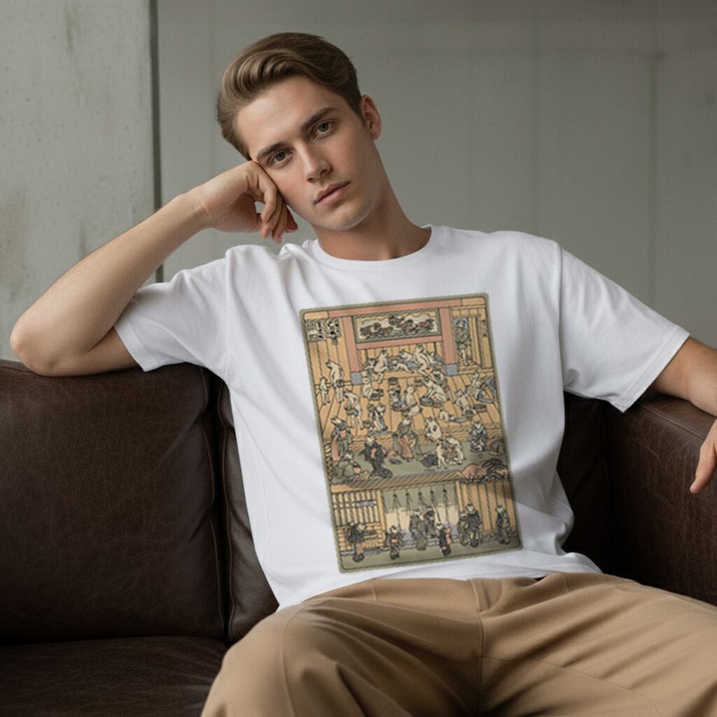 江戸時代の人気浮世絵師、歌川芳藤の有名な『猫の湯屋(猫の遊廓)』をモチーフにした、ユニークなTシャツです。