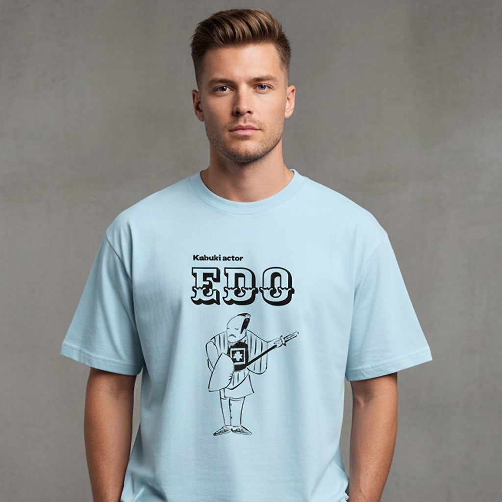 日本の伝統芸能、歌舞伎の役者をモチーフにした、シンプルながらも存在感のあるデザインTシャツです。 レトロなフォントの「EDO」と、味のある線画で描かれた役者の姿が、着る人に「粋(いき)」な和の雰囲気を添えます。