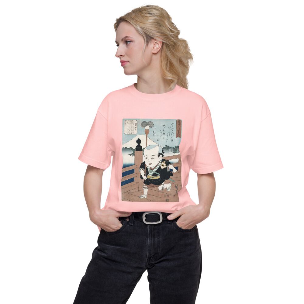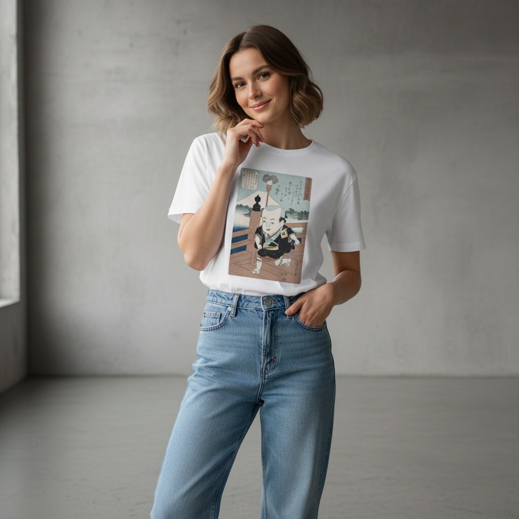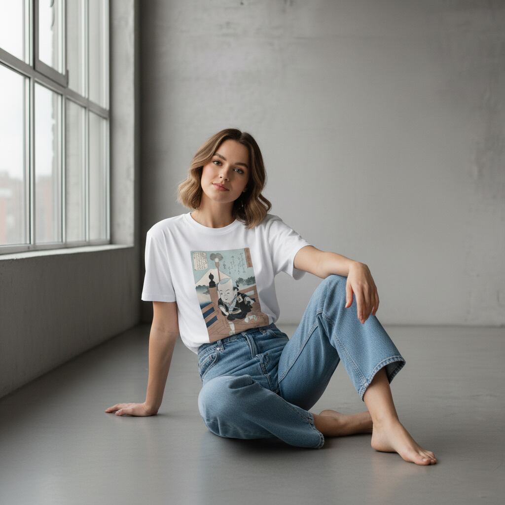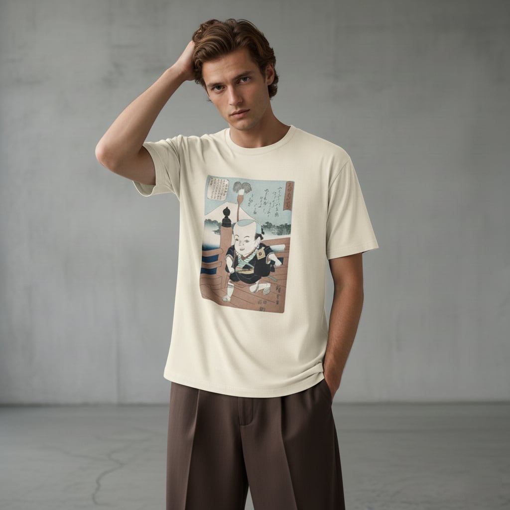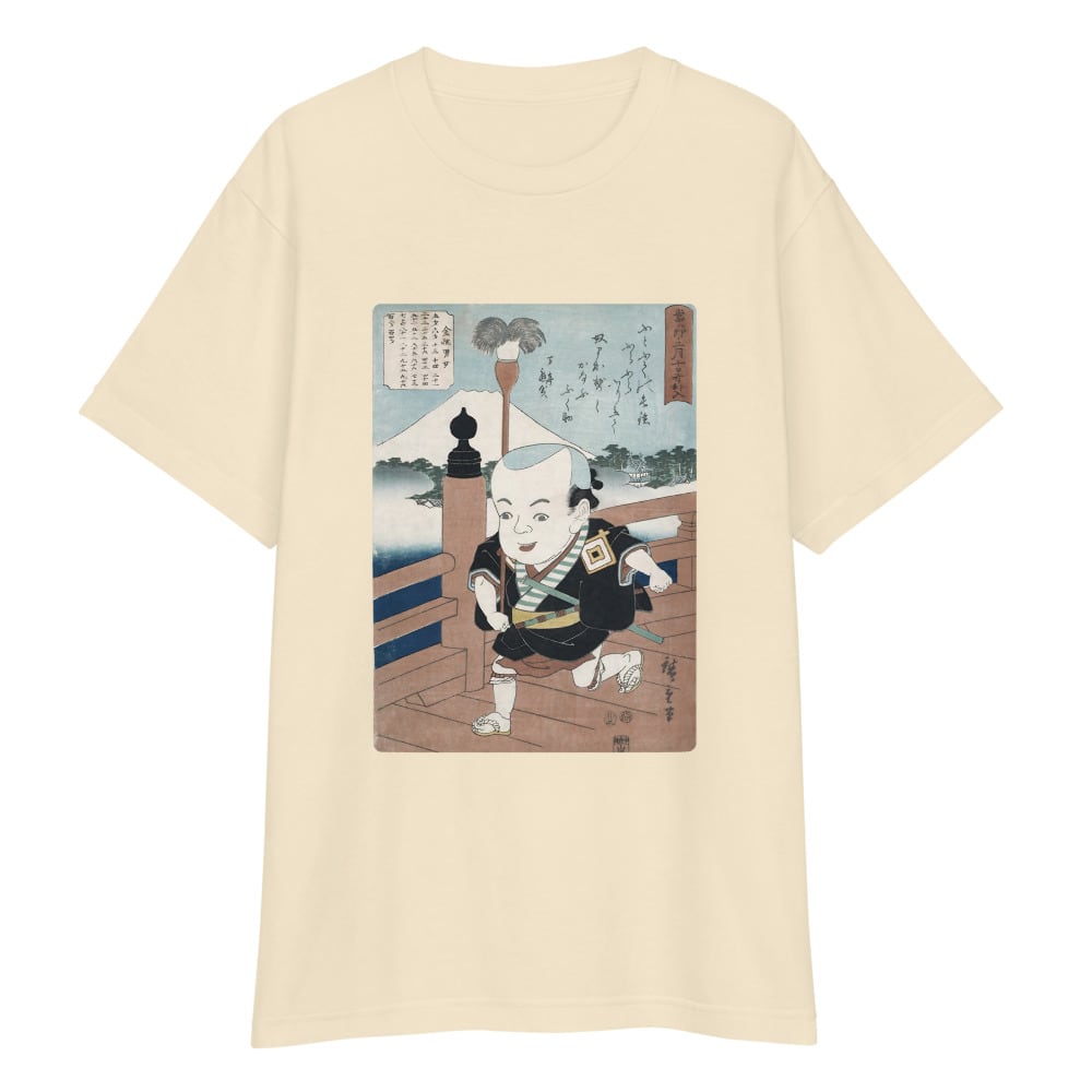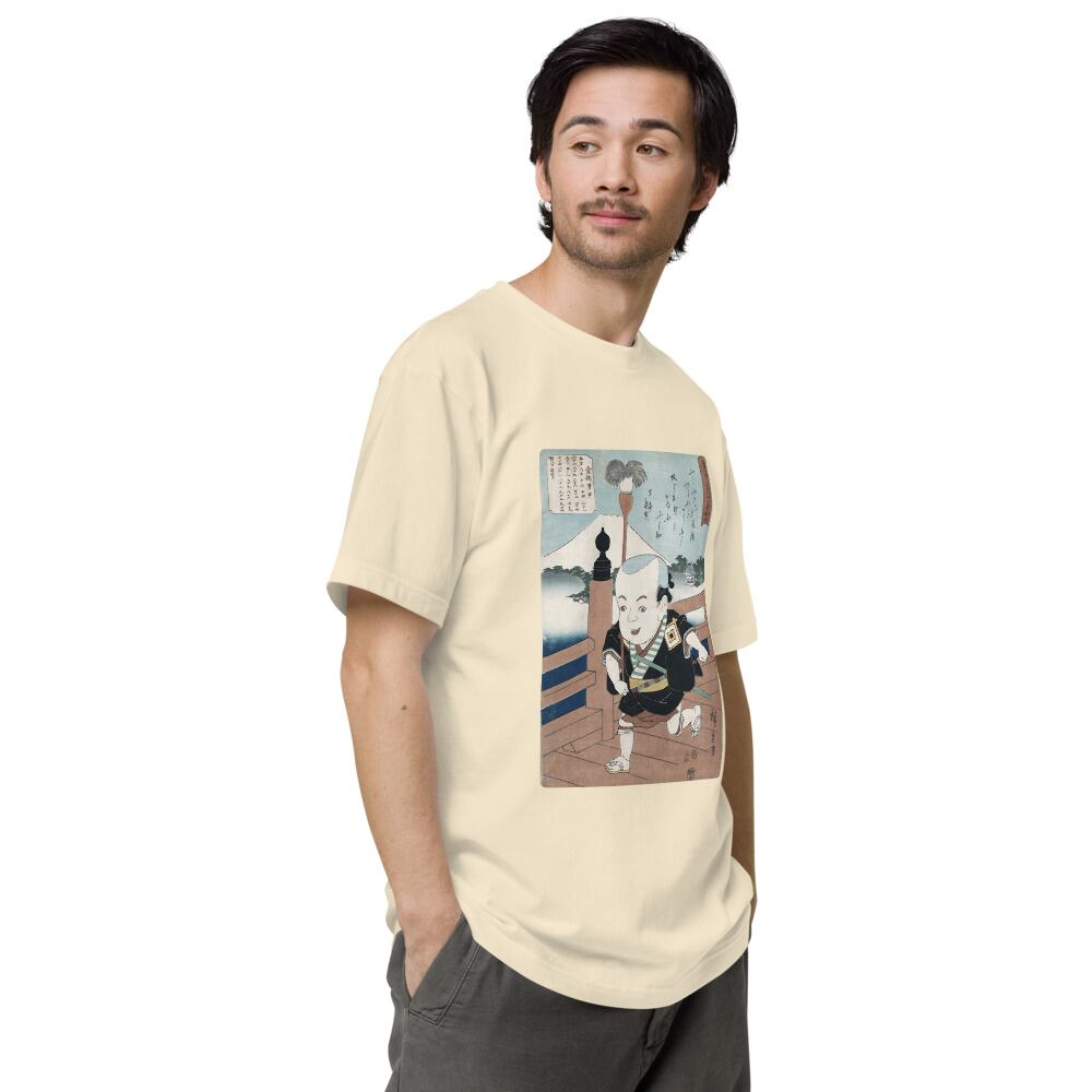 背景にそびえる富士山と、奥行きのある橋の描写。広重ならではの計算された構図が、Tシャツというキャンバスで現代に蘇ります。