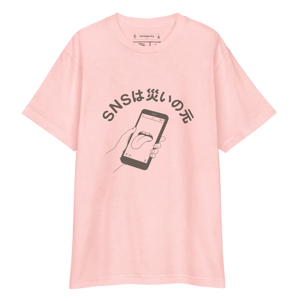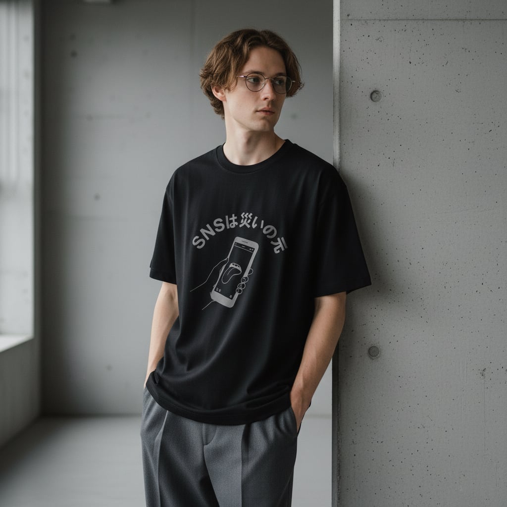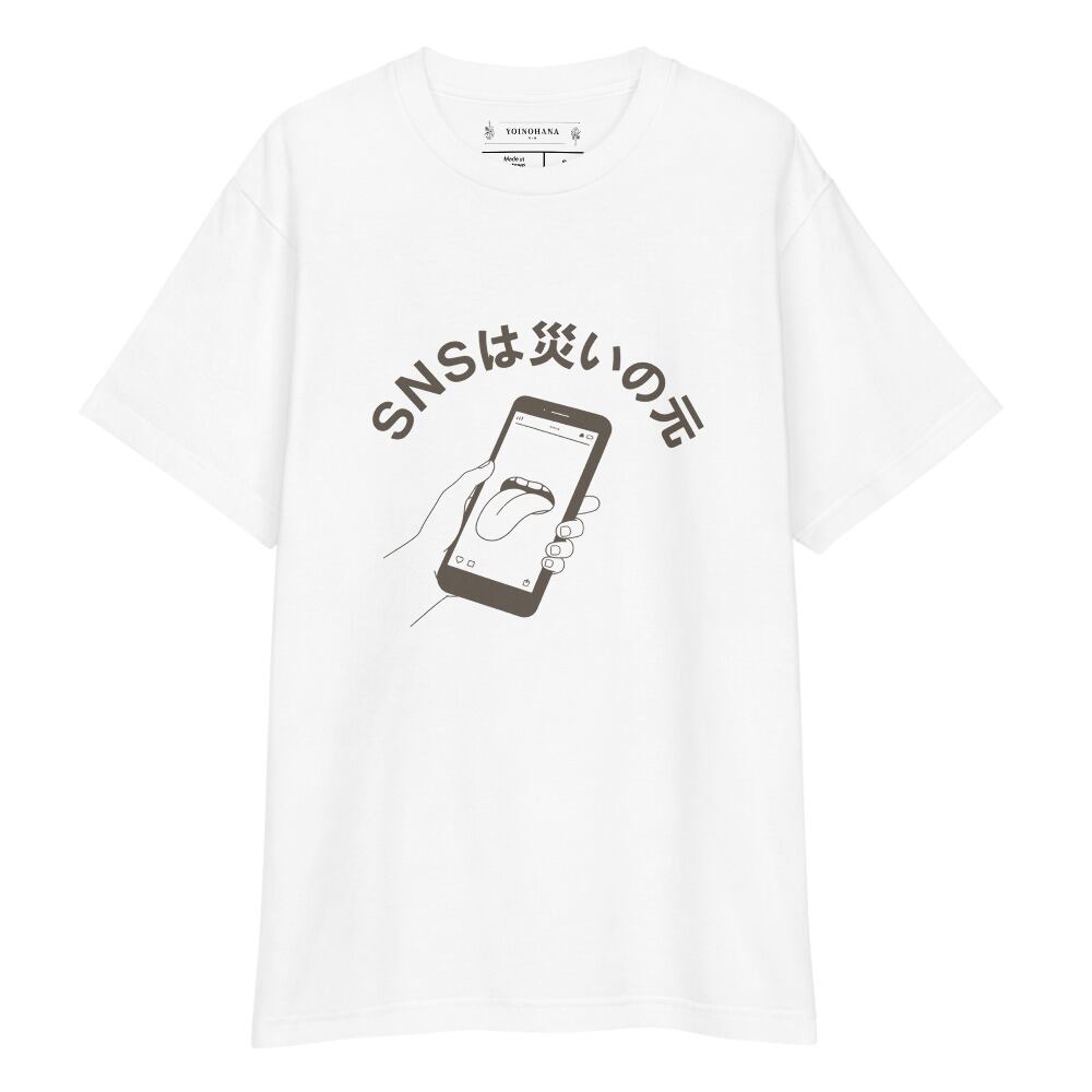 スマートフォンから伸びる舌のイラストに、どこか不穏で、それでいてユーモラスな「SNSは災いの元」の文字を添えた一着です。