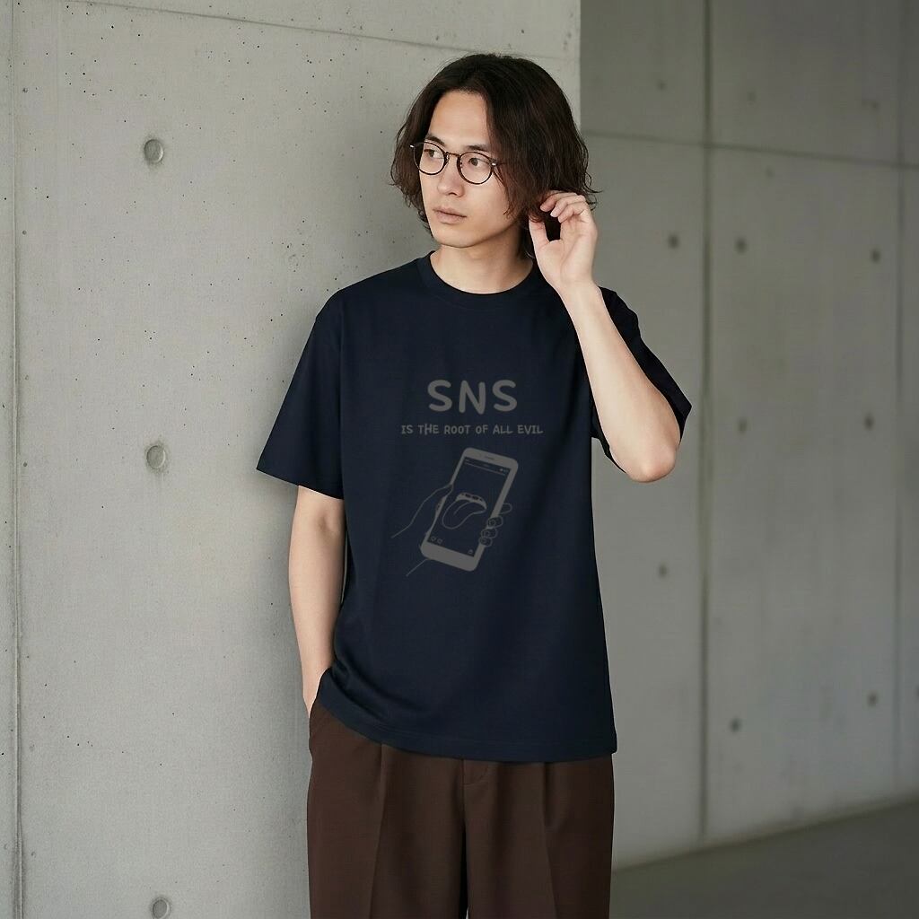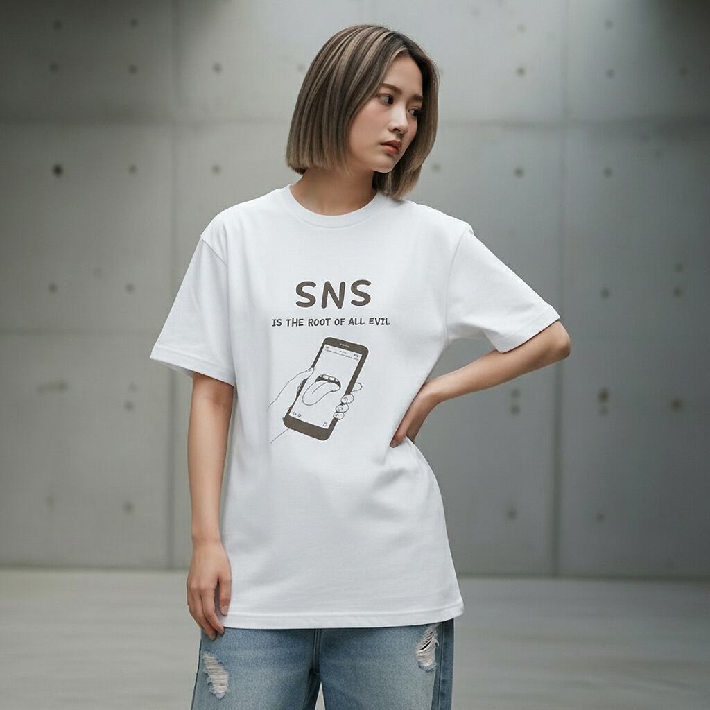 アウターからチラリと覗く「SNS」の文字に、